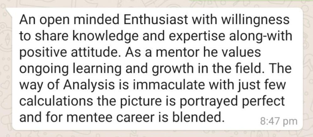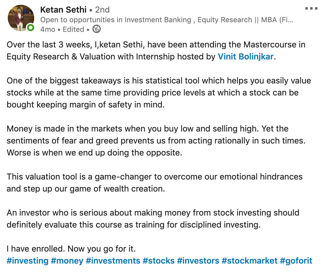 I am a first year management student and I always look for new opportunities to build my acumen in the financial domain. I came across this master course on LinkedIn and thought it'd be a great value addition to my skillset. I'm writing this after the very first lecture of the course and I can already tell that I'm very glad to have opted for this course. The lecture started with the basic introduction and a brief understanding of how the markets actually work. Sir used many real life examples to make it more relatable and easy to comprehend. Sir also addressed to a whole lot of questions with complete satisfaction. Although the session seemed a little fast paced, I think it'll be compensated with the replays provided. He even stressed on revising all the points discussed so as to keep everybody on the same page and running. Overall, I am super excited to attend the further lectures and I'm confident about the value addition I'll obtain after its completion!