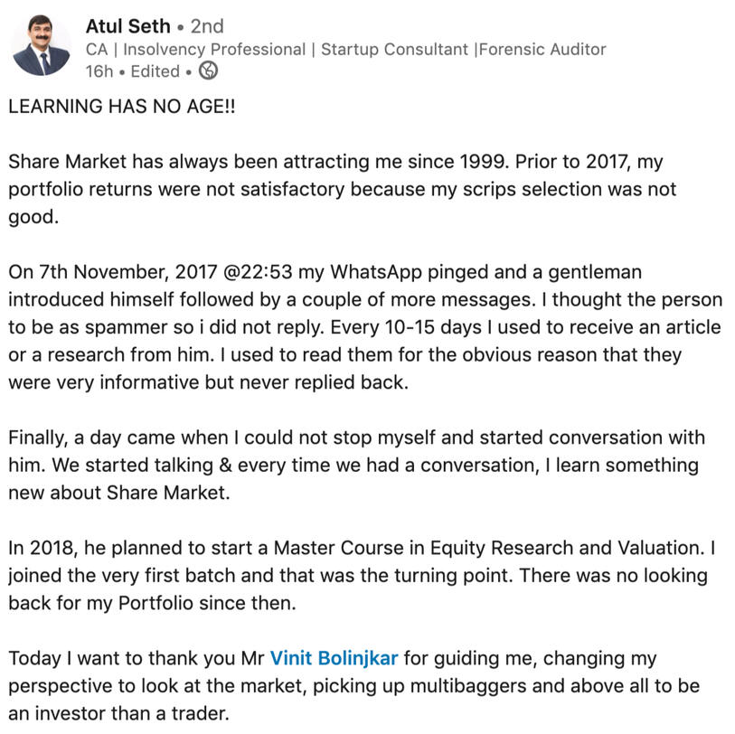 I had recently signed up for the mastercourse by Vinit sir. Though the first session was introduction. He emphasized on the importance of selecting a company with a sound management and how important a promoter is to the success and growth of the company. Taking examples from the likes of Raymond and jyothi labs, I really consider myself lucky for getting this opportunity to learn from a market veteran. He taking the time to answer even the most basic of questions exemplifies his love for teaching. Looking forward to continue learning under his guidance.